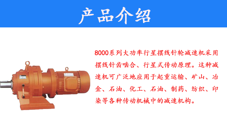 8000系列大功率行星擺線針輪減速機(jī)采用擺線針齒嚙合、行星式傳動(dòng)原理。這種減速機(jī)可廣泛地應(yīng)用于起重運(yùn)輸、礦山、冶金、石油、化工、石油、制藥、紡織、印染等各種傳動(dòng)機(jī)械中的減速機(jī)構(gòu)。