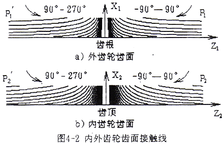 由(4-1-10)式和式(4-1-12)式通過計算,可以得到內(nèi)外齒輪齒面上接觸線坐標,由計算出的坐標值即可繪出接觸線圖形。