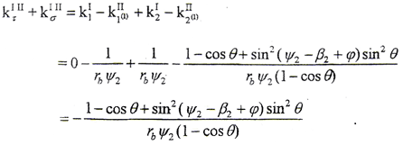 在齒高方向,由于k2Ⅰ與ψ1和t1有關(guān),是否存在在曲率干涉,需進行計算才能確定。在齒寬中截面上,k2Ⅰ=1/(rbψ1),由于內(nèi)外齒輪存在軸間傾角θ,由Eular公式可計算出與k2Ⅱ同方向的外齒輪齒面法曲率,k2Ⅰ′=cos2θ/(rbψ1)。由接觸點計算知,在齒寬中截面上的接觸點ψ1=ψ2,因此存在k2Ⅰ′<k2Ⅱ,即說明存在曲率干涉,且θ越大,曲率干涉越嚴重。
