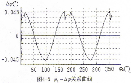 (2)以一對齒在一轉(zhuǎn)中始終嚙合為例計算分析可知,△φ的變化除在純翻轉(zhuǎn)區(qū)稍有波動外,總體約呈余弦規(guī)律變化,如圖4-5所示,這說明運動是非勻速的。當理論嚙合齒對在△φ為零的點嚙合時,與其相鄰的齒對若要嚙合,它的△φ值約為10-5弧度數(shù)量級;