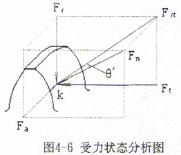 在接觸點K處,受力狀態(tài)如圖4-6所示。作用在外齒輪輪齒K點的總作用力為Fn,F(xiàn)n可分解為切向力Ft,徑向力Fr和軸向力Fa。由圖4-6知