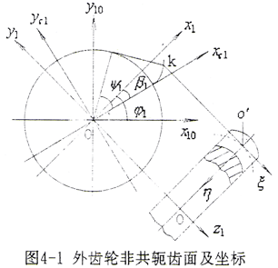 外齒輪齒面及坐標系如圖4-1所示。此處只討論在平行于端面的各截面上,為不同變位系數(shù)的漸開線外齒輪。