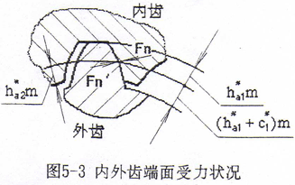 一般鼓形齒聯(lián)軸器的齒頂高系數(shù)ha1*=1,徑向間隙系數(shù)c1*=0.25,全齒高h=2.25m,采用標準齒輪,其內(nèi)外齒輪分度圓齒厚大致相等。它的主要優(yōu)點是內(nèi)外齒輪加工工藝性好,可采用標準齒輪滾刀和插齒刀進行加工,且尺寸計算簡單。但是這種鼓形齒聯(lián)軸器的外齒輪齒根抗彎強度比內(nèi)齒輪齒根抗彎強度要低,即內(nèi)齒輪齒根彎曲強度有富余。因此,可設(shè)法增加外齒輪齒厚,提高外齒輪齒根彎曲強度。通常采用兩種方法:一是采用特殊刀具減簿內(nèi)齒輪齒厚而增加外齒輪齒厚,使內(nèi)外齒輪的抗彎強度接近一致;另一種方法是采用變位短厚齒型內(nèi)外齒輪,降低外齒輪齒高,加大外齒輪齒厚,使其粗短,以提高外齒輪的抗彎強度[75]。前一種方法需采用專用的瘦齒型滾刀,這給加工帶來不少麻煩,因此在國內(nèi)不宜推廣。文獻[75]所出了一種變位短厚齒型鼓形齒聯(lián)軸器的設(shè)計制造方法,由于是采用標準滾刀和插齒刀進行加工,加工方法簡單易行,因此工藝性好,生產(chǎn)效率高,是一種較理想的適宜推廣應(yīng)用的設(shè)計加工方法。但是,該文提出采用齒頂高系數(shù)ha1*=0.8不一定合理,因為齒頂高系數(shù)的確定一方面要使內(nèi)外齒輪齒根彎曲強度一致,另一方面又要使內(nèi)外齒輪齒面具有足夠的接觸強度及內(nèi)齒輪齒頂厚應(yīng)大于0.25m。因此必須建立優(yōu)化數(shù)學模型進行計算來確定。將內(nèi)外齒輪輪齒簡化成懸臂梁受力(如圖5-3所示)[127],本問題是要使內(nèi)外齒輪齒根有接近的齒根彎曲強度,則目標函數(shù)為